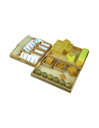 Sada obsahuje: 1 ks zlatá tisícová krychle 10 ks zlaté stovkové čtverce 45 ks zlatých desítek 100 ks zlatých jednotek 6 ks zlatých kalíšků 1 ks tác pro stovkový perlový řetěz 1 ks podložka pro devět dřevěných krychlí znázorňujících 1000 1 ks devět dřevěných krychlí znázorňujících 1000 1 ks dřevěná krabička na perličky 1 ks podložka na 45 ks dřevěných stovkových čtverců 1 ks 45 ks dřevěných stovkových čtverců 2 ks tác na perlové čtverce a krychle 1 ks malé dřevěné karty s čísly 1 - 9000 3 ks malé dřevěné karty s čísly 1 - 3000 1 ks velké dřevěné karty s čísly 1 - 1000 1 ks velké dřevěné karty s čísly 1 - 9000