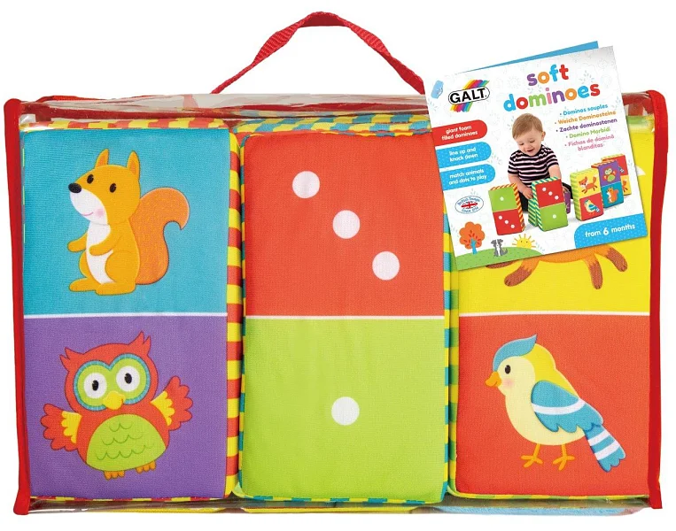 Šest velkých dominových kostek s molitanovou výplní, které se dají stavět a bořit. Starší děti můžou hrát domino nejdřív tak, že budou k sobě dávat dvojice lesních zvířátek a pak počítat puntíky na kostkách.