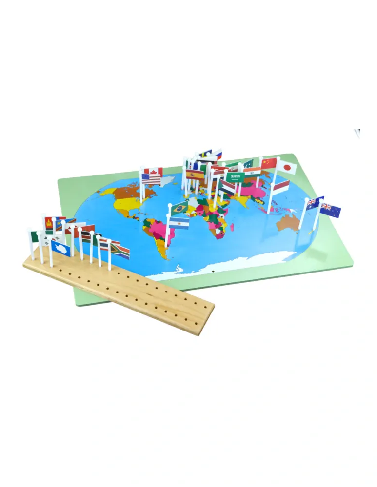 Každému státu přísluší státní vlajka, která je nejprve umístěna na stojánku a po té ji dítě přiřazuje k jednotlivým státům. Dítě se pomocí této pomůcky učí polohy států světa a podobu jejich státní vlajky.