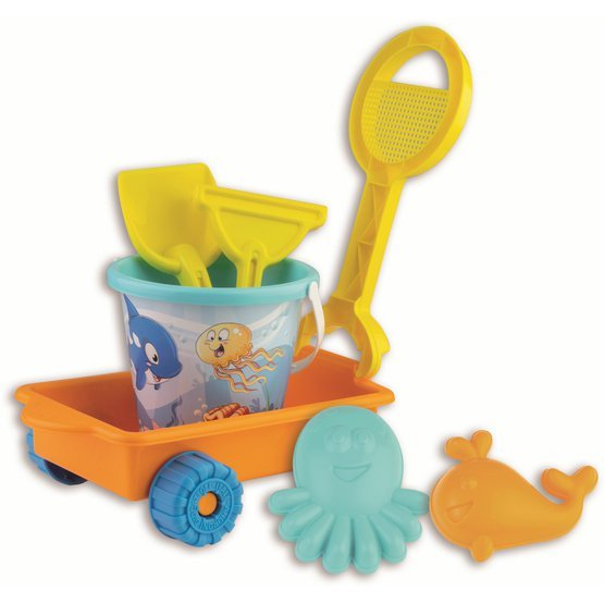 6dílná sada na písek, vyrobená z kvalitních plastů v Itálii. Obsahuje: Vozík s rukojetí, jejíž konec lze využít jako sítko, kyblík, lopatku, hrabičky a tvořítka ve tvaru chobotnice a velryby. Rozměry vozíku: 27 x 22 x 10 cm (d x š x v), délka rukojeti 30 cm, kyblík o průměru 17 cm a výšce 16 cm. Sada: 30 x 22 x 27 cm (d x š x v). Váha: 0,60 kg. Doporučený věk od 12 měsíců.
