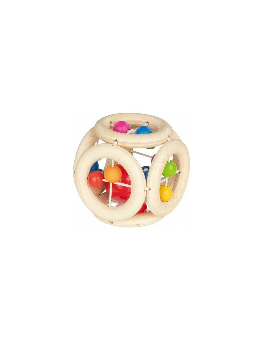 Dřevěné chrastítko ve tvaru kostky vytvořené z kroužků zaujme miminka nejen svým pestrobarevným zbarvením a netradičním tvarem, ale zároveň cinkáním kuličky schované uvnitř.