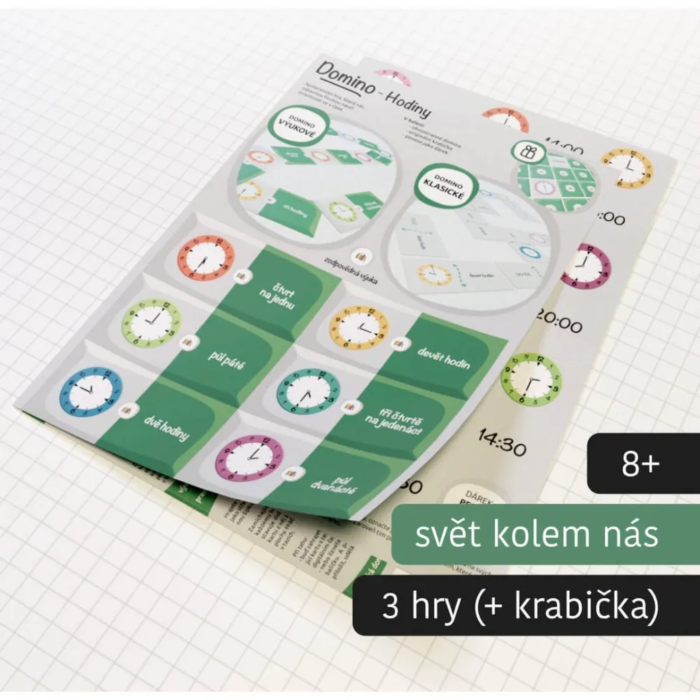Výukové domino obsahuje dvě samostatné hry po 14 kartách. Rozlišíte je podle odlišného středového symbolu. Šedý okraj je analogový čas a text, zelený okraj je analogový a digitální čas. Hrajete tedy vždy jen se 14 kartami.
