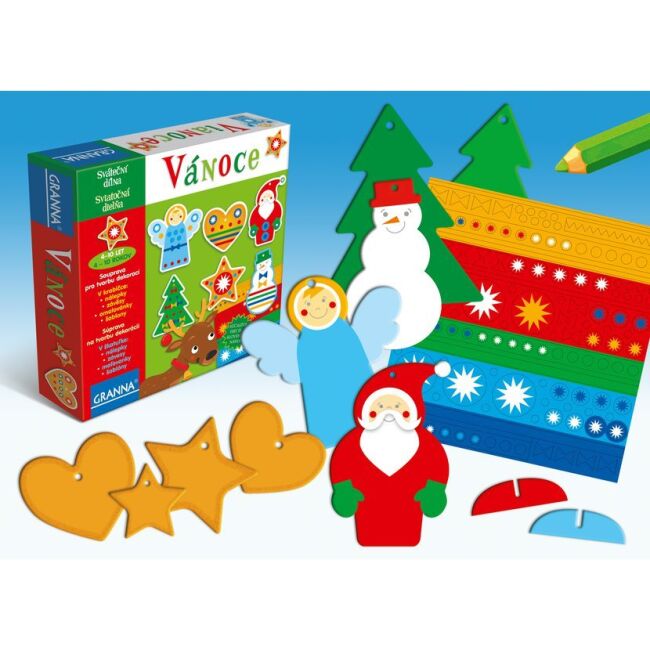 Tematicky zaměřená kreativní souprava, díky které si děti mohou vytvořit nádherné dekorativní vánoční ozdoby. Mikulášové, sněhuláci, andílci, perníčky a stromečky v několika velikostech čekají na čtyřech arších ze silného, pevného kartonu. Z jedné strany jsou tyto motivy barevné a k jejich ozdobení slouží přiložený aršík barevných nálepek různých tvarů. Z druhé strany jsou všechny tvary bílé a poskytují dětem prostor pro tvořivou práci s pastelkami, fixy apod., a to jak podle přiložených vzorů, tak na základě vlastní fantazie. Některé dekorace je možné díky přiloženým stojánkům postavit, jiné zavěsit (šňůrky nejsou součástí balení). Po vytlačení jednotlivých motivů z archů umožňuje sada i další využití – všechny čtyři archy lze použít jako šablony, s jejichž pomocí si děti mohou všechny motivy překreslovat na libovolný podklad a vytvářet tak nekonečné množství vlastních ozdob s nejrůznějším dekorem.