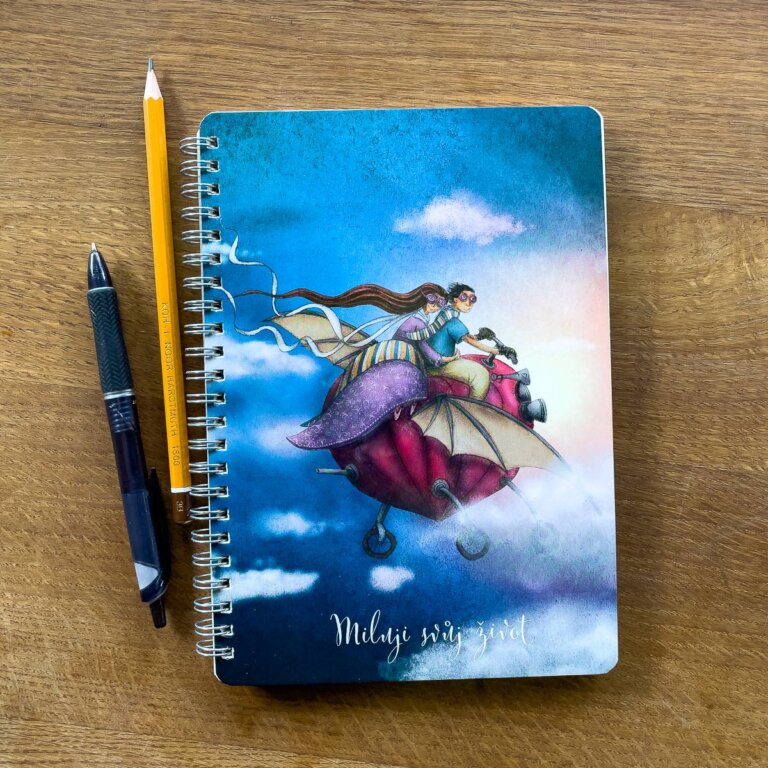 Praktický kroužkový, čistý zápisník formátu A5 (14,8 x 21 cm) s 50 listy hezkého lehce nažloutlého papíru Holmen Book, po kterém tužka 3B příjemně drandí. Přední obálka s obrázkem je ze silného (350 g) křídového papíru. Zadní obálka je ze silného šedého kartonu bez potisku. Vazba je kroužková – drátěná.