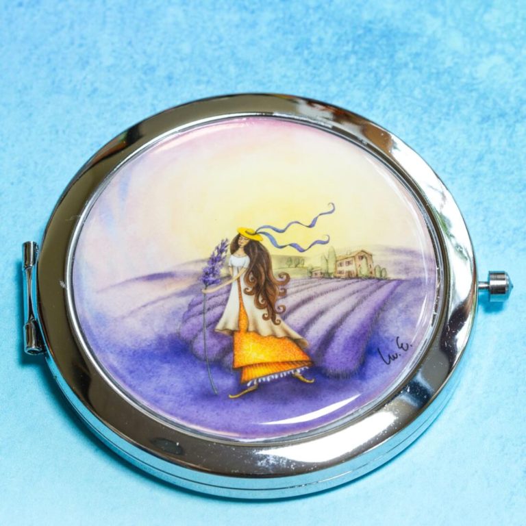 Kvalitní kosmetické zrcátko do kabelky s autorským obrázkem. Průměr je 7 cm, průměr vlastního zrcátka je 5,5 cm.