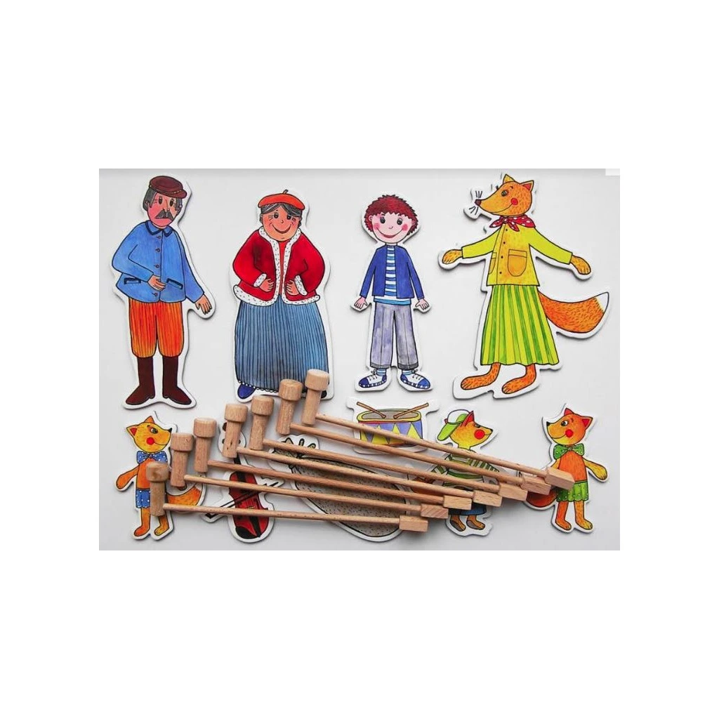 7 postavy, 3 rekvizity, 7 dřevěných tyček