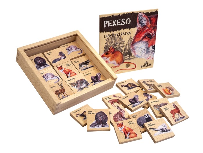 Pexeso vyrábí u nás v dílně české ruce z kvalitního českého certifikovaného dřeva. Balení obsahuje 36 dílků o velikosti 4,5 × 4,5 cm s jednostranným potiskem. Baleno v dřevěné krabičce z masivu s vysouvacím víkem  16 x 16 x 4 cm.  Autorem kreseb jsou čeští ilustrátoři, obrázky jsou chráněny auto... celý popis