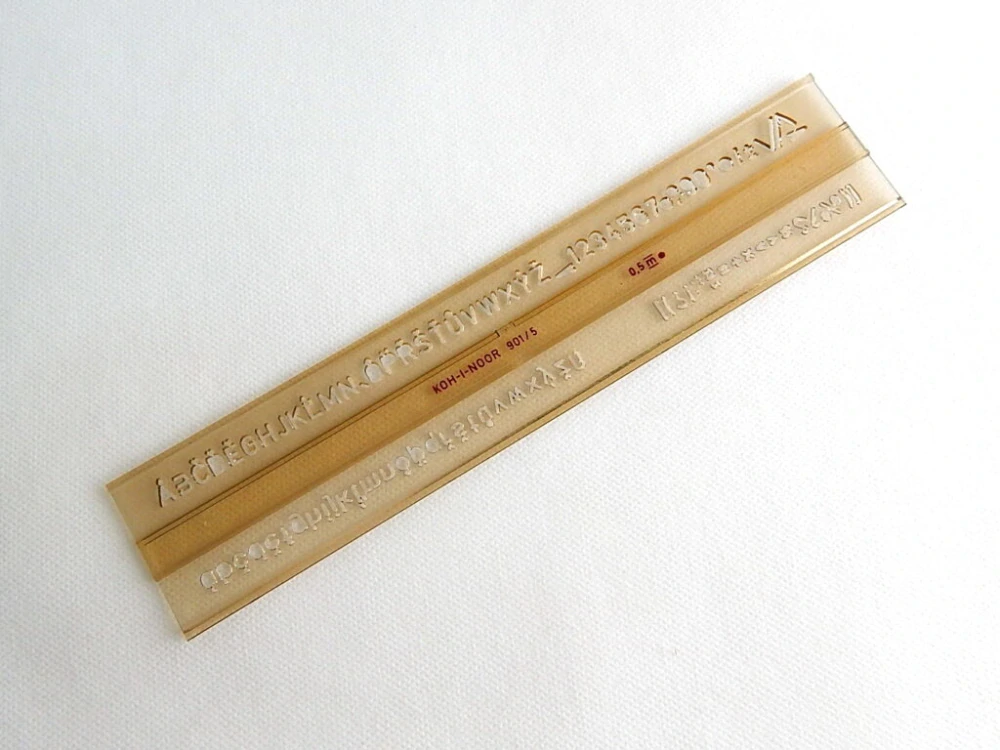 Písmenková šablona vyrobená z kouřového průhledného styroluxu. Je určena pro práci s technickým perem 0,5 mm. Obsahuje znaky velké a malé abecedy, číslic a matematických znaků. Veškeré znaky jsou velikosti 5 mm a tvaru kolmého písma dle ČSN. Šablona je určena k popisování ve škole i v kanceláři. Zabalena je do celotransparentního polypropylenového pouzdra s papírovou vložkou a eurozávěsem.
