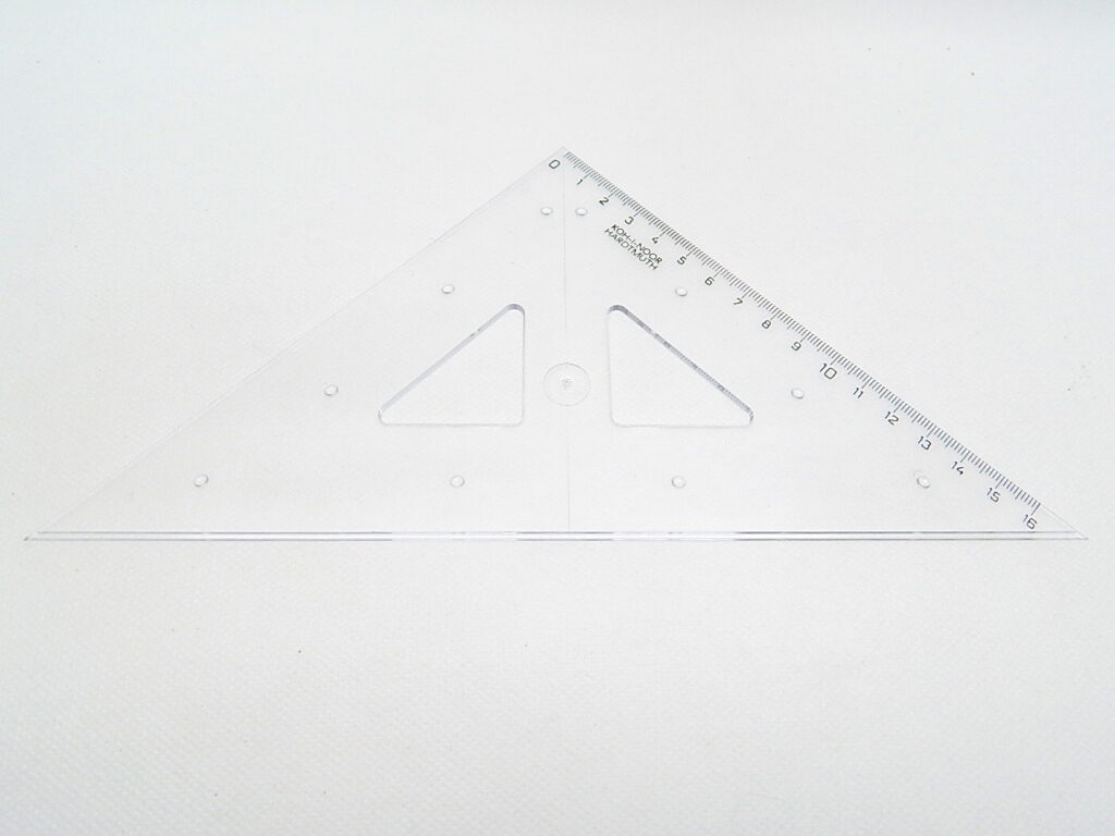 Trojúhelník 45/177 s kolmicí a prolisky vyrobený z čirého průhledného polystyrenu. Stupnice je naražena technologií horké ražby. Přesnost stupnice 0,2% délky. Mimo délkové stupnice je vybaven i ryskou pro konstruování kolmic. Na spodní straně je opatřen prolisky Trojúhelník je určený k technickému kreslení ve škole i v kanceláři. Výhodou jsou prolisky pro pohodlnější práci s tuší a snadnější posouvání po papíře. Zabalen je do polyetylenového sáčku s eurozávěsem.