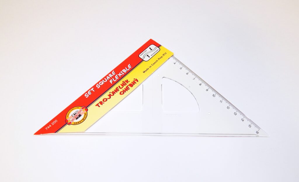 Trojúhelník 45/177 s kolmicí vyrobený z čirého průhledného styroluxu. Stupnice je tištěna technologií přesného sítotisku. Tisk je odolný proti opotřebení při běžném používání. Přesnost stupnice 0,2% délky. Mimo délkové stupnice je vybaven i ryskou pro konstruování kolmic. Trojúhelník je určený k rýsování a technickému kreslení ve škole i v kanceláři. Vzhledem k použitému materiálu při výrobě má trojúhelník mnohonásobně zvýšenou odolnost proti mechanickému poškození. Zabalen je do celotransparentního polypropylenového pouzdra s papírovou vložkou a eurozávěsem.